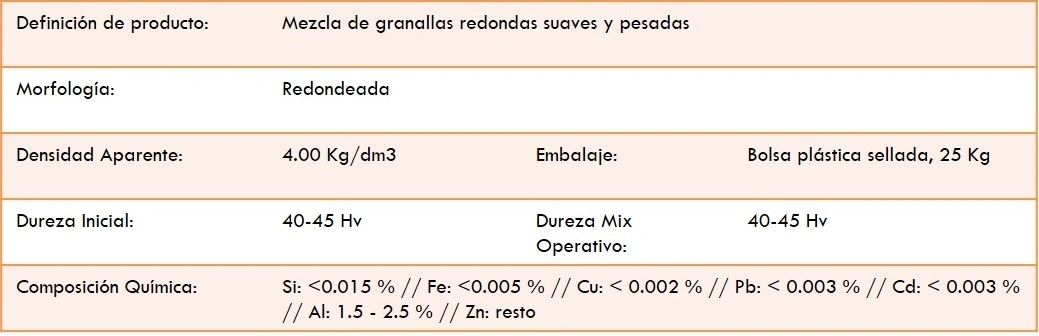 Fina mezcla de granallas blandas y pesadas con presencia de Aluminio para eliminar rebabas y aumentar considerablemente el brillo final de la pieza tratada.