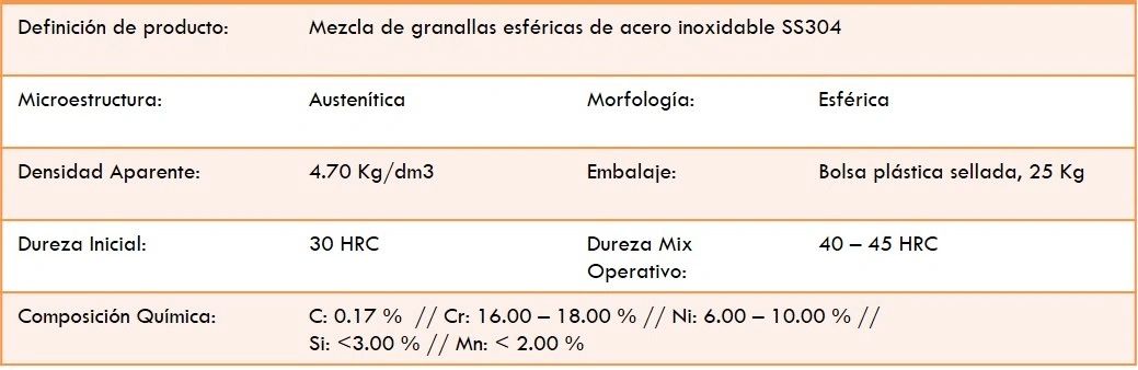 Fina mezcla de granallas esféricas de Acero Inoxidable SS304 austenítico, para un acabado suave y cobertura controlada.