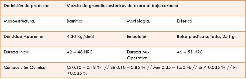 Mezcla de granallas esféricas de Bajo Carbono, en distintos tamaños y de baja dureza, que por su plasticidad Bainítica alcanzan una larga vida.